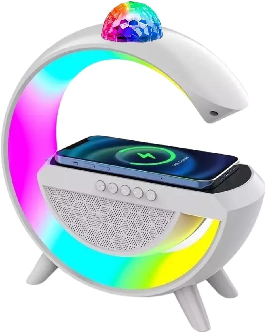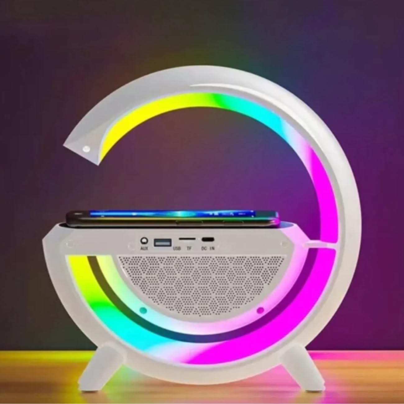 Com design elegante e tecnologia multifuncional, ela combina luminária LED ajustável, alto-falante Bluetooth, rádio FM, relógio digital, despertador e carregador sem fio wireless — tudo em um só produto.