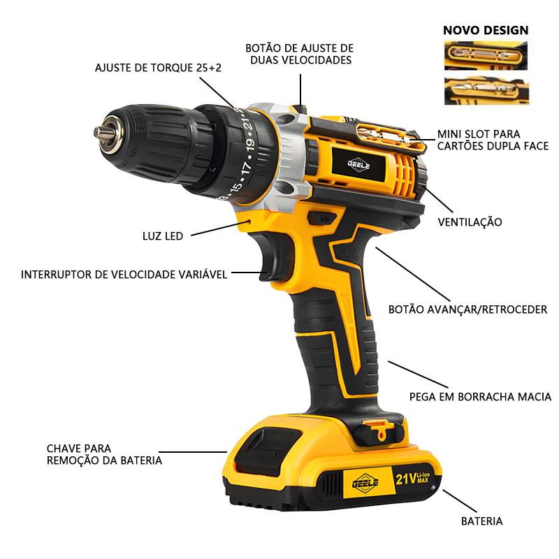 Alta potência de 21V, ideal para parafusar e perfurar madeira, metal e plástico.