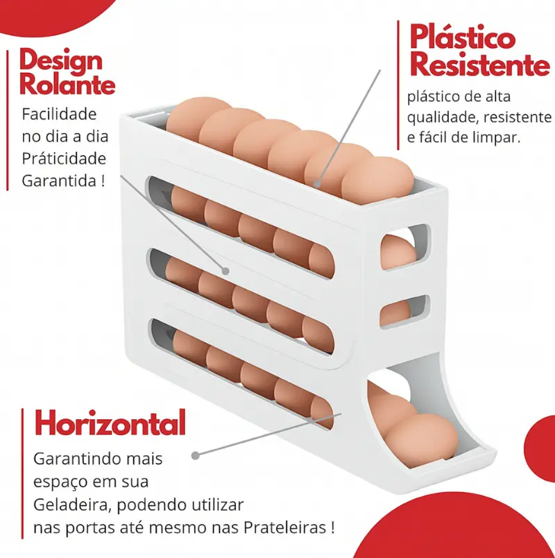 Mantenha seus ovos sempre frescos e organizados com o Porta Ovos Automático 4 Camadas. Um produto prático, elegante e indispensável para sua cozinha moderna.