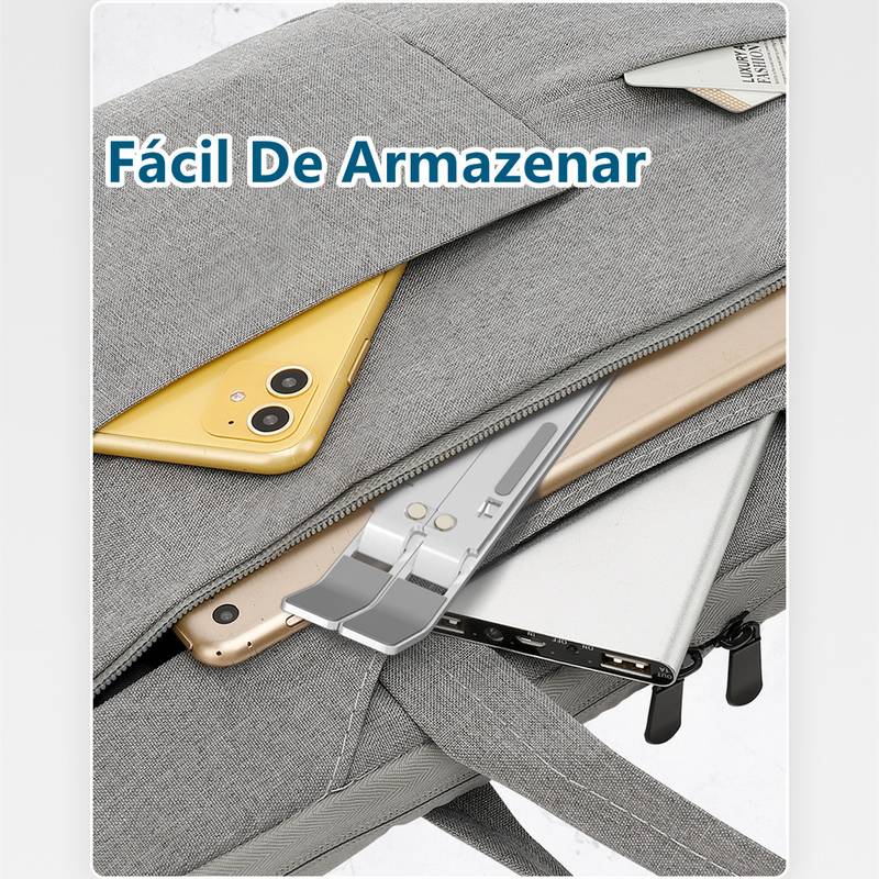 Leve, compacto e dobrável, o suporte cabe facilmente na mochila ou pasta. Perfeito para uso em casa, escritório, faculdade ou viagens.